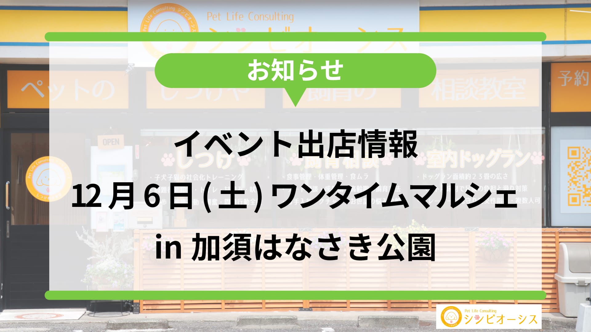 【イベント】ワンタイムマルシェに出店決定!12月6日加須はなさき公園にて開催2025.11.28 イベント 岡田 敏宏 犬猫専門飼育相談&しつけ教室|Pet Life Consulting シンビオーシス