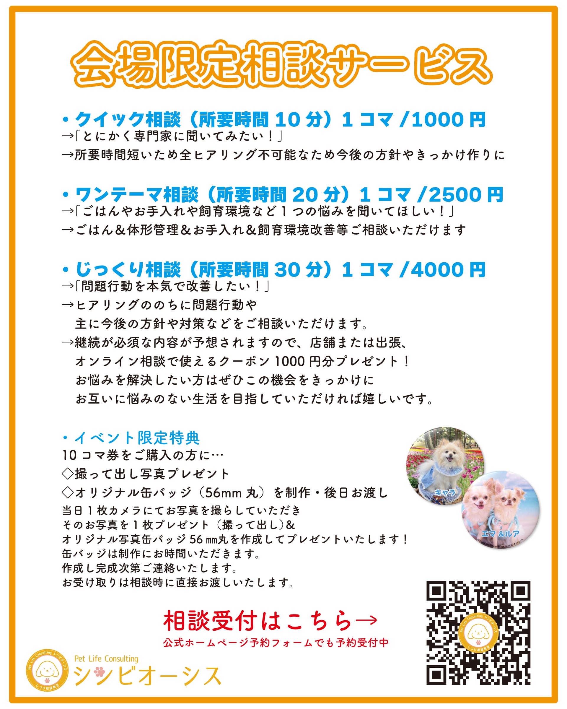 ※しつけに関してはご存知の通り1回では解決しないことご了承ください。継続と飼い主様家族のご協力が必要となります。この相談の機会をきっかけに、皆様や愛犬の抱える問題の解決やより良い愛犬との幸せな暮らしを目指して継続して学んでいっていただけると幸いです。