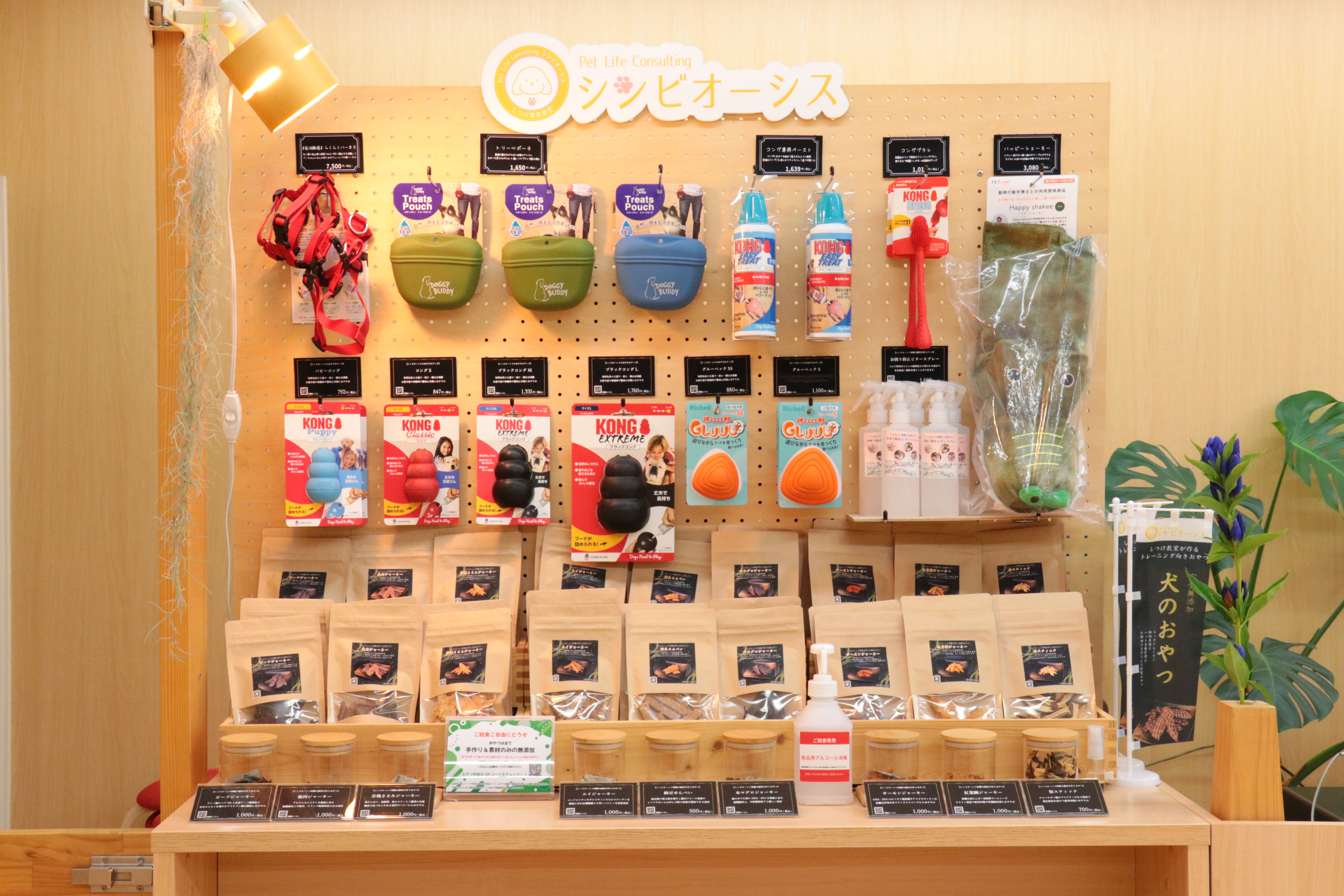 シンビオーシス特性手作りおやつや選び抜いた知育玩具・しつけ用品などの物販コーナーも併設しています。